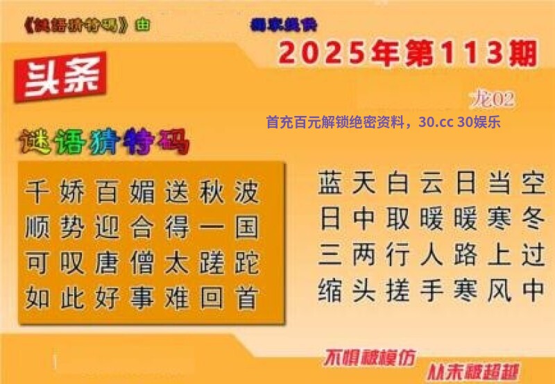 113期六合头条【解迷语猜特码】 千娇百媚送秋波 顺势迎合得一国 可叹唐僧太蹉跎 如此好事难回首 解译:送秋,秋解秋肖,唐僧,解男肖 九肖:马鸡虎猪猴鼠蛇狗兔 |